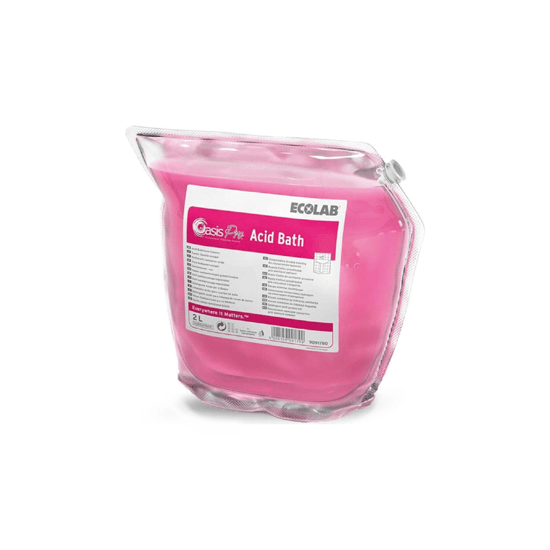 Ecolab Oasis Pro Acid Bath 2 L, lavabolar, duşakabinler, fayanslar ve armatürlerde oluşan sert su yüzey lekeleri, kireç ve sabun artıklarını derinlemesine temizleyen profesyonel bir asidik banyo temizleyicisidir. Konsantre formülü, ekonomik dozajla maksimum performans sunar. Yüzeyleri pürüzsüz, doğal parlaklıkta ve lekesiz bırakır. Daha hijyenik banyo alanları için ideal çözümdür.